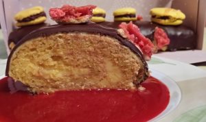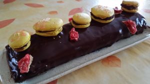 Celle ci est agrémentée d’éclat de praline ainsi que des macarons.